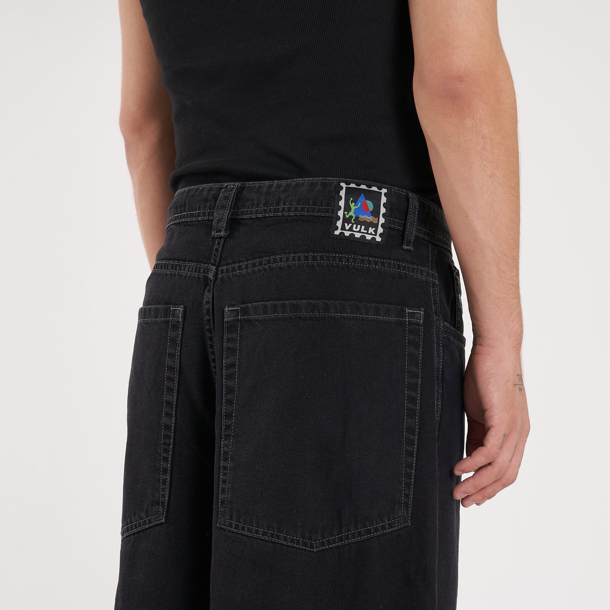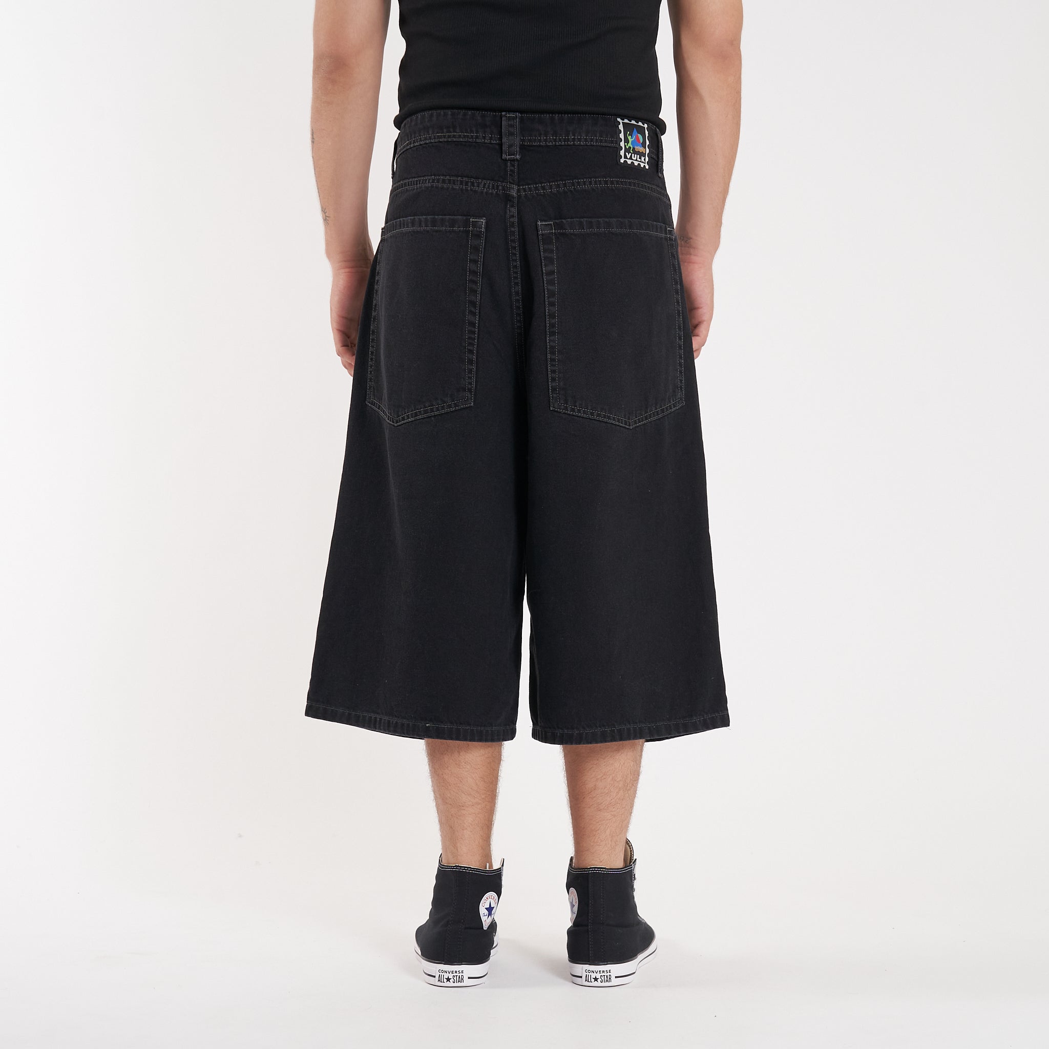 Detalles: Botones y remaches metálicos.Etiqueta de tejida multicolor en cintura y bordado en bolsillo delantero. Bolsillos extra grandes en espalda y cordón de algodón para ajuste interno en cintura. Lavado negro parejo con reservas en costuras