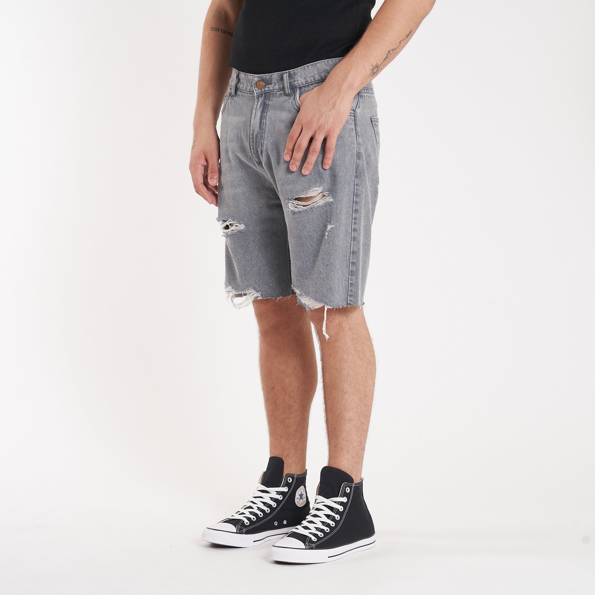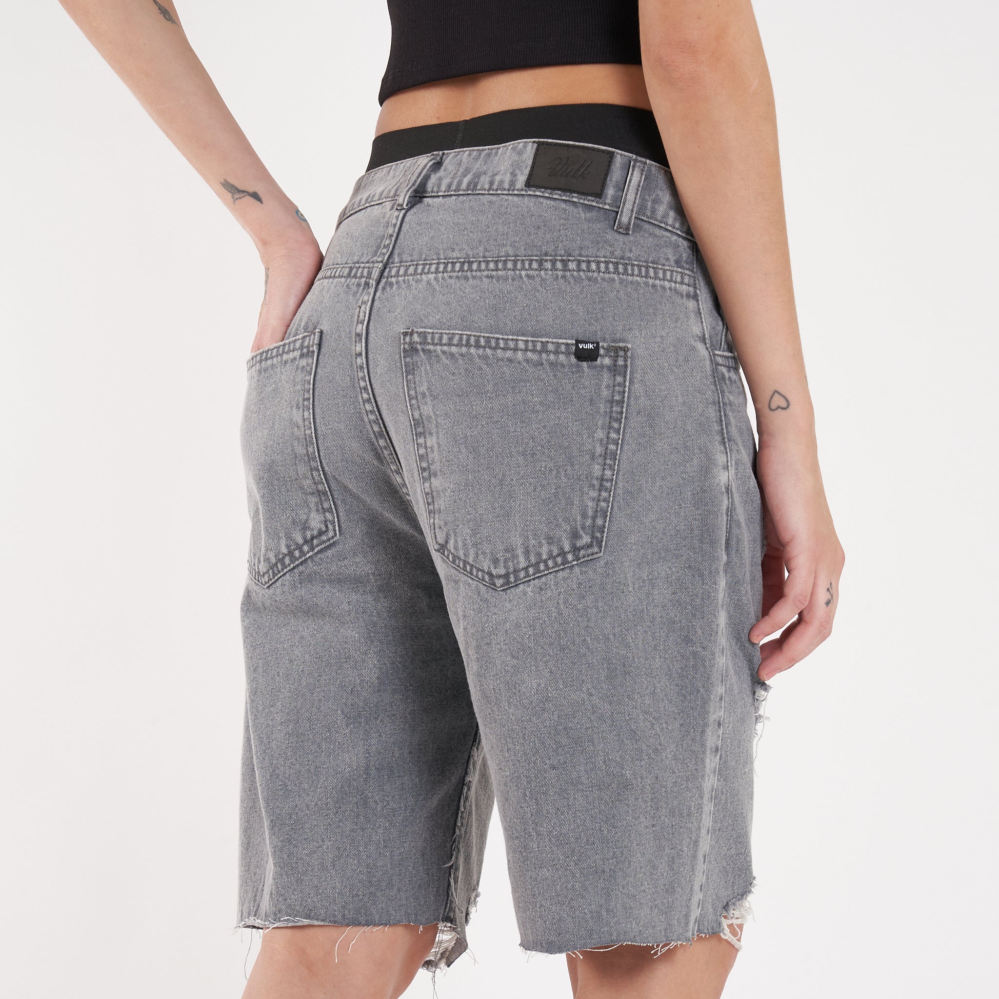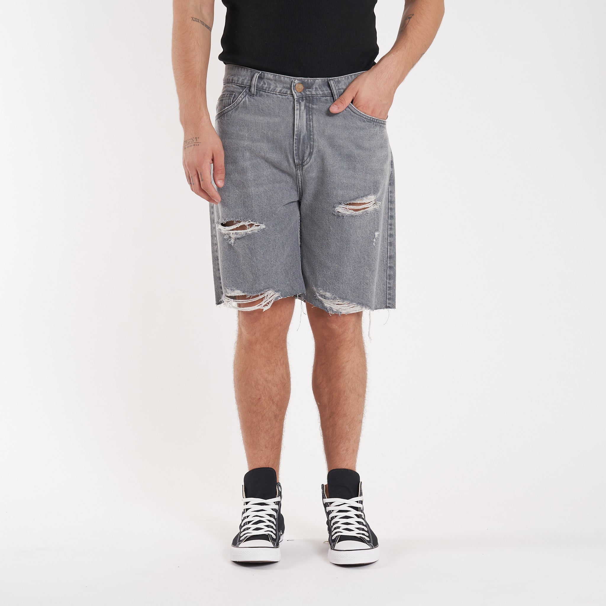 Detalles: Botones y remaches metálicos.Etiqueta de ecocuero en cintura. Roturas en piernas y ruedo al corte. Lavado negro-gris acid wash