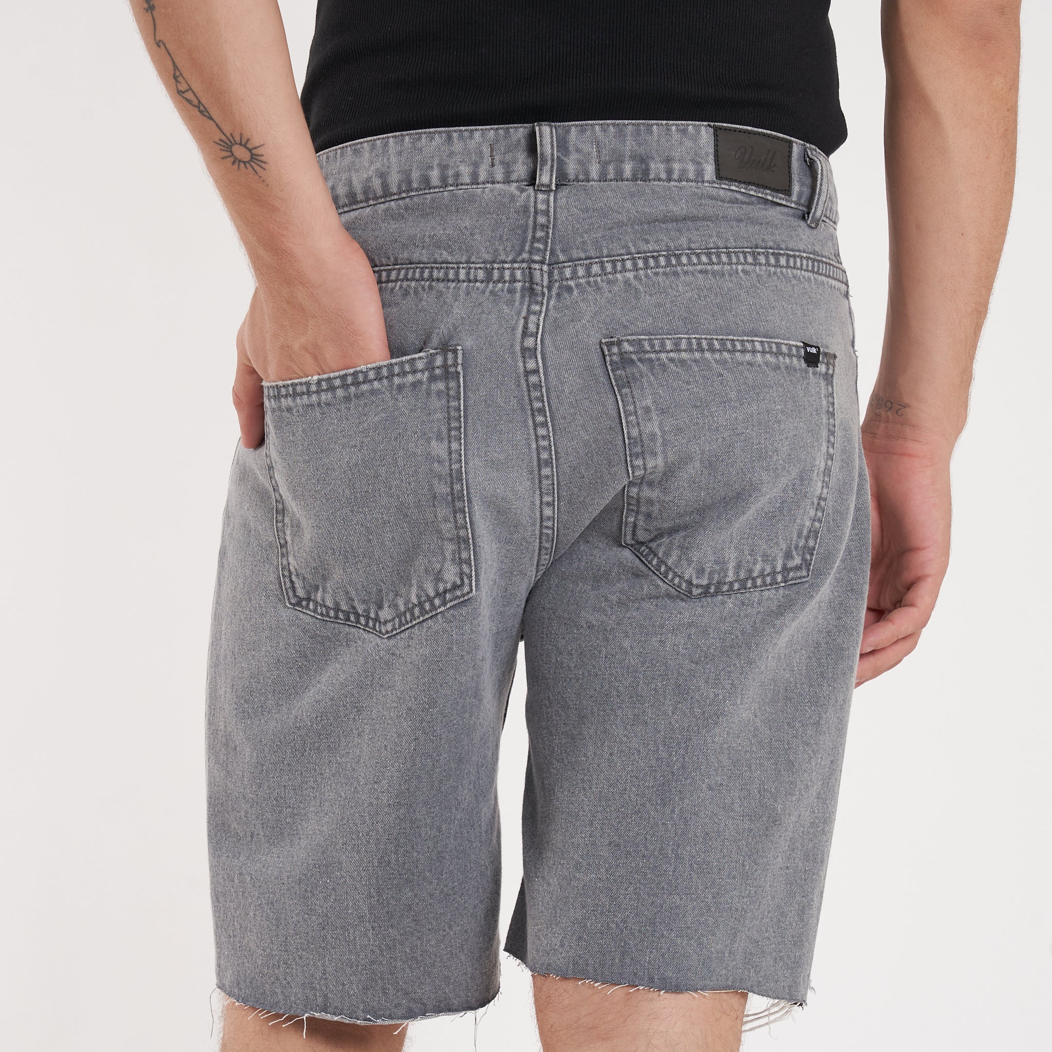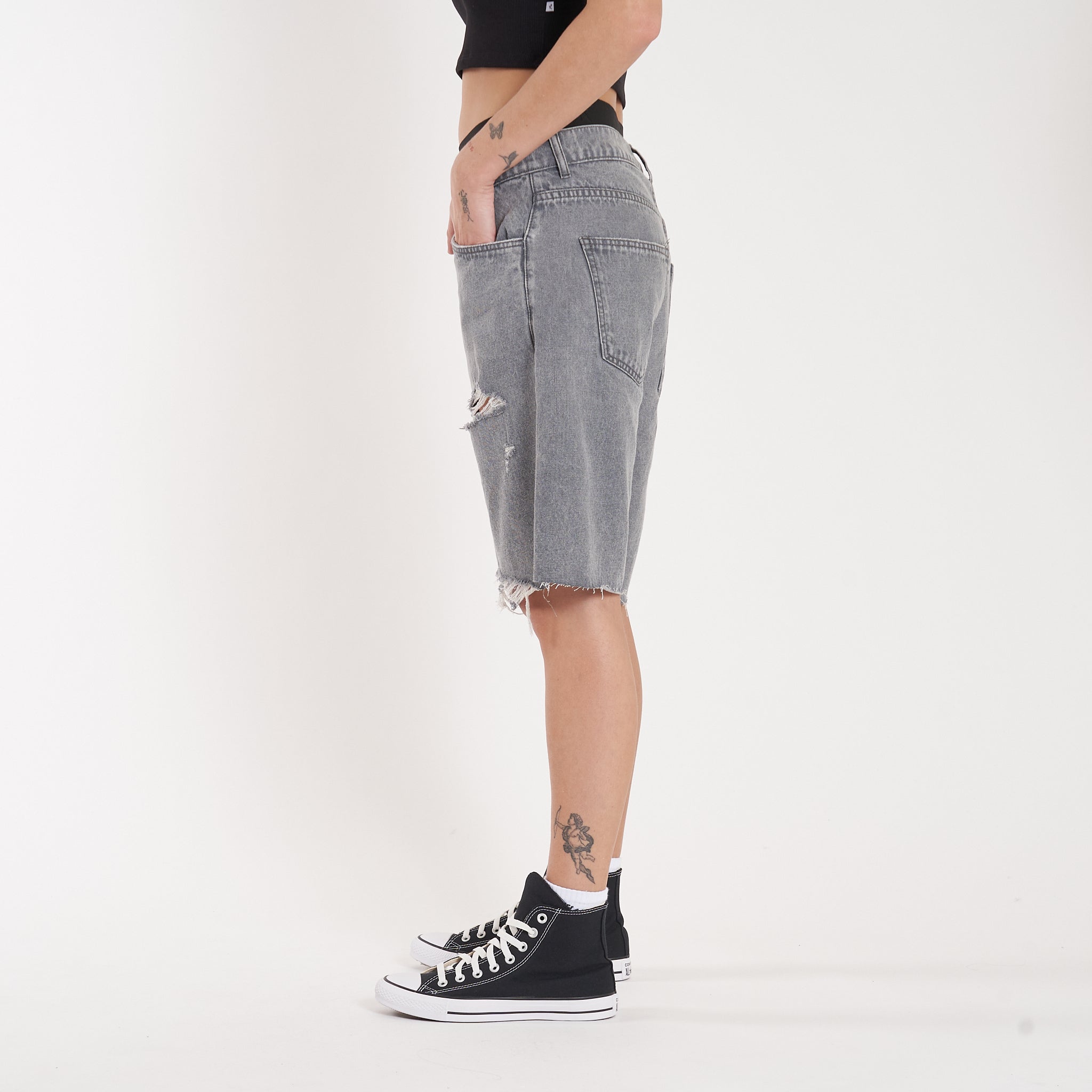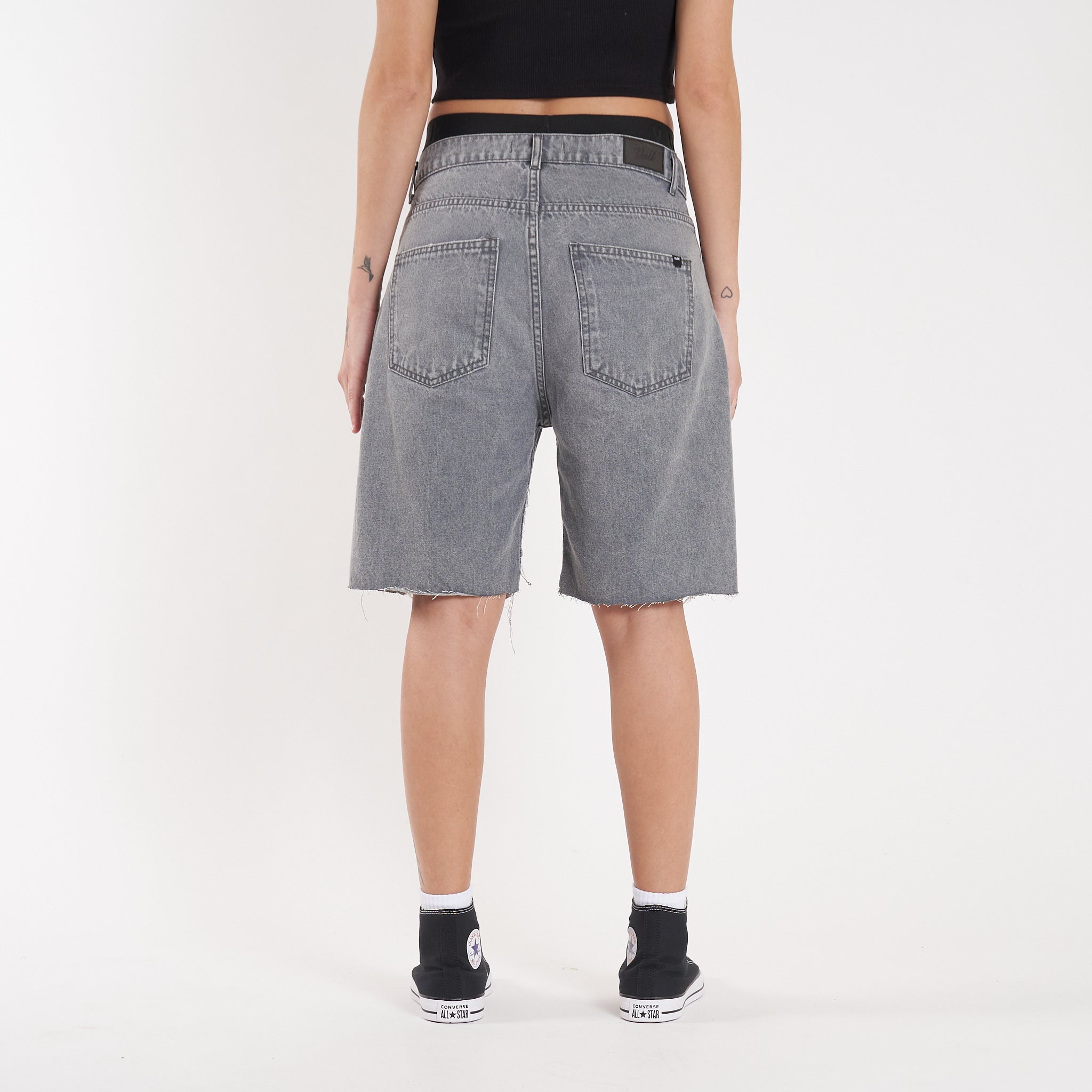 Detalles: Botones y remaches metálicos.Etiqueta de ecocuero en cintura. Roturas en piernas y ruedo al corte. Lavado negro-gris acid wash