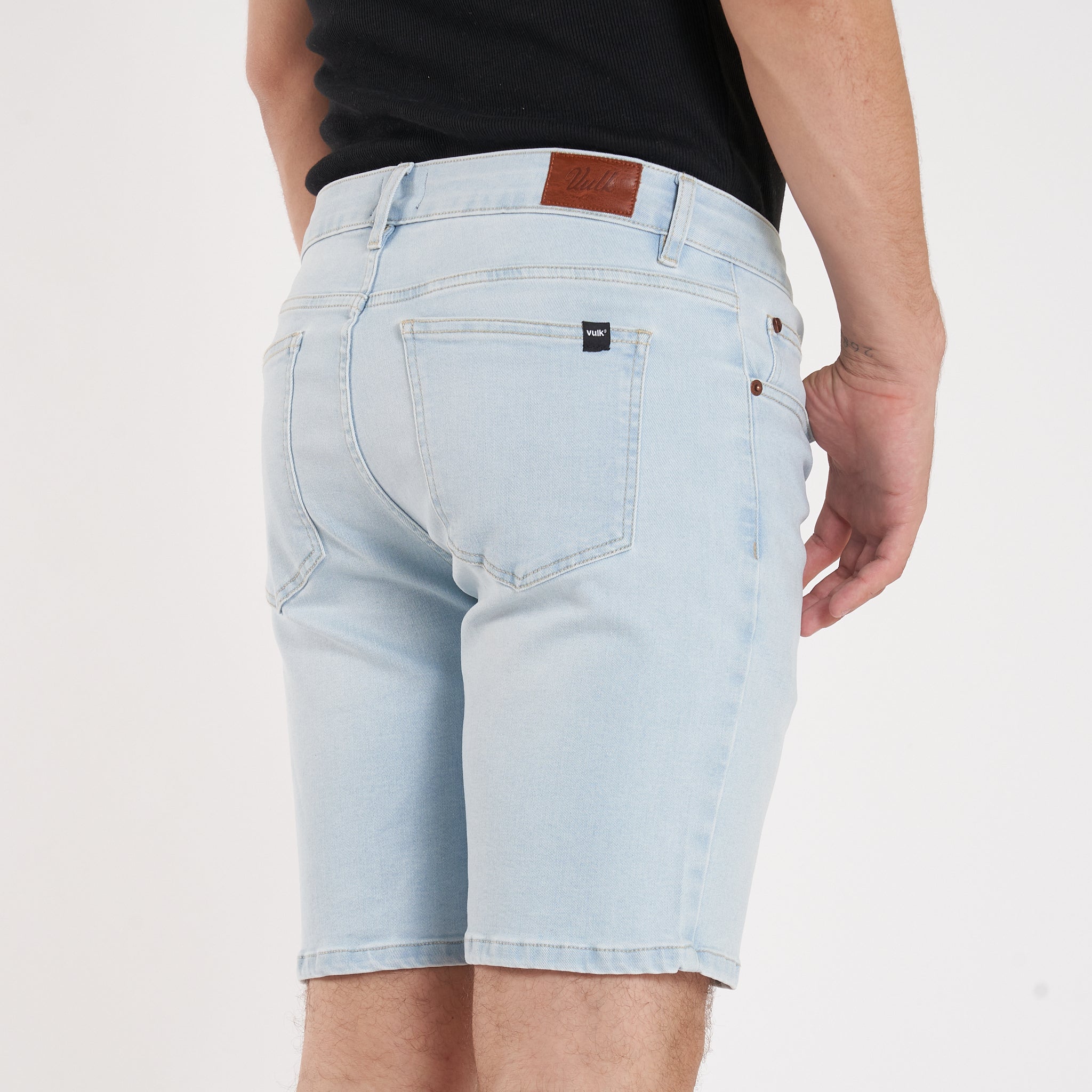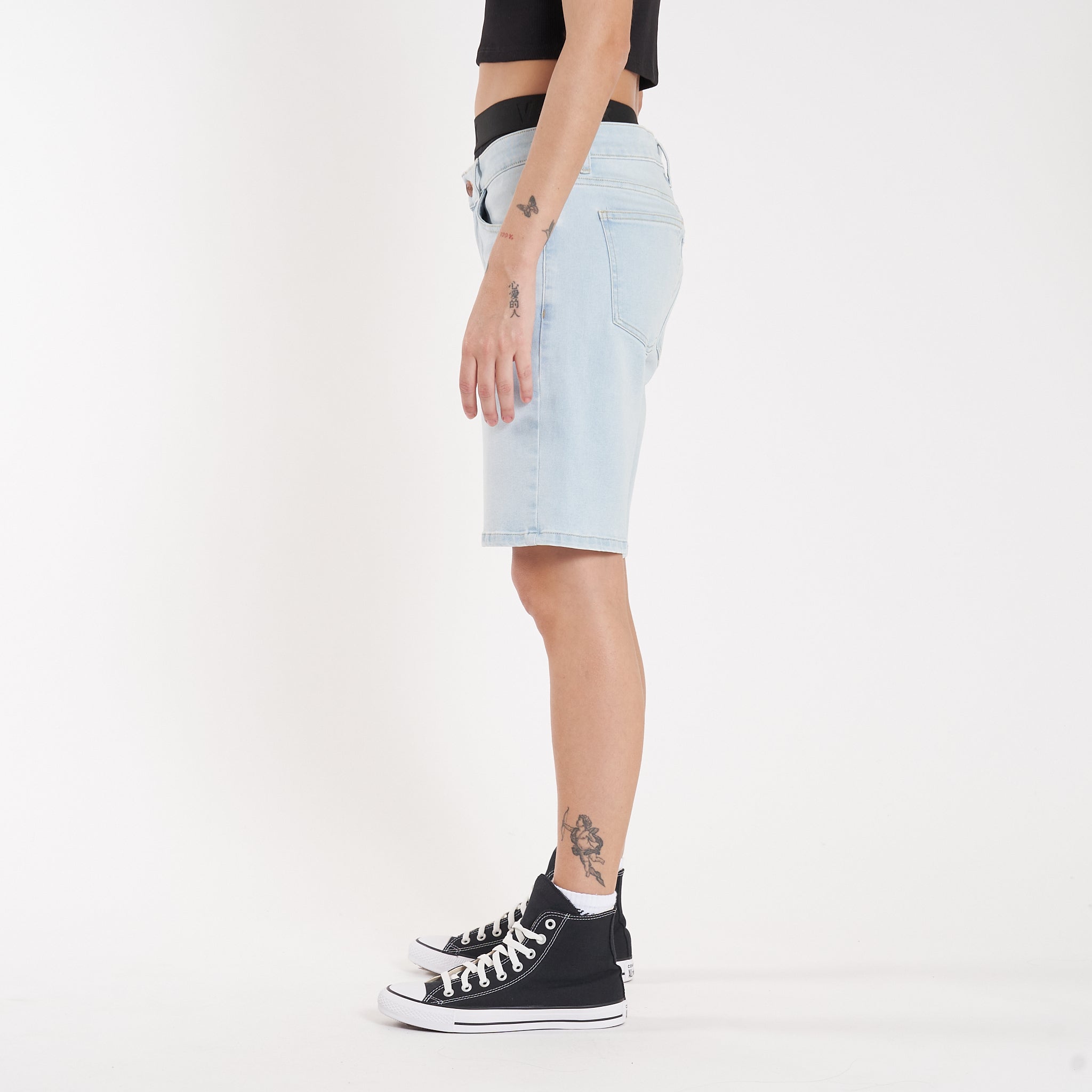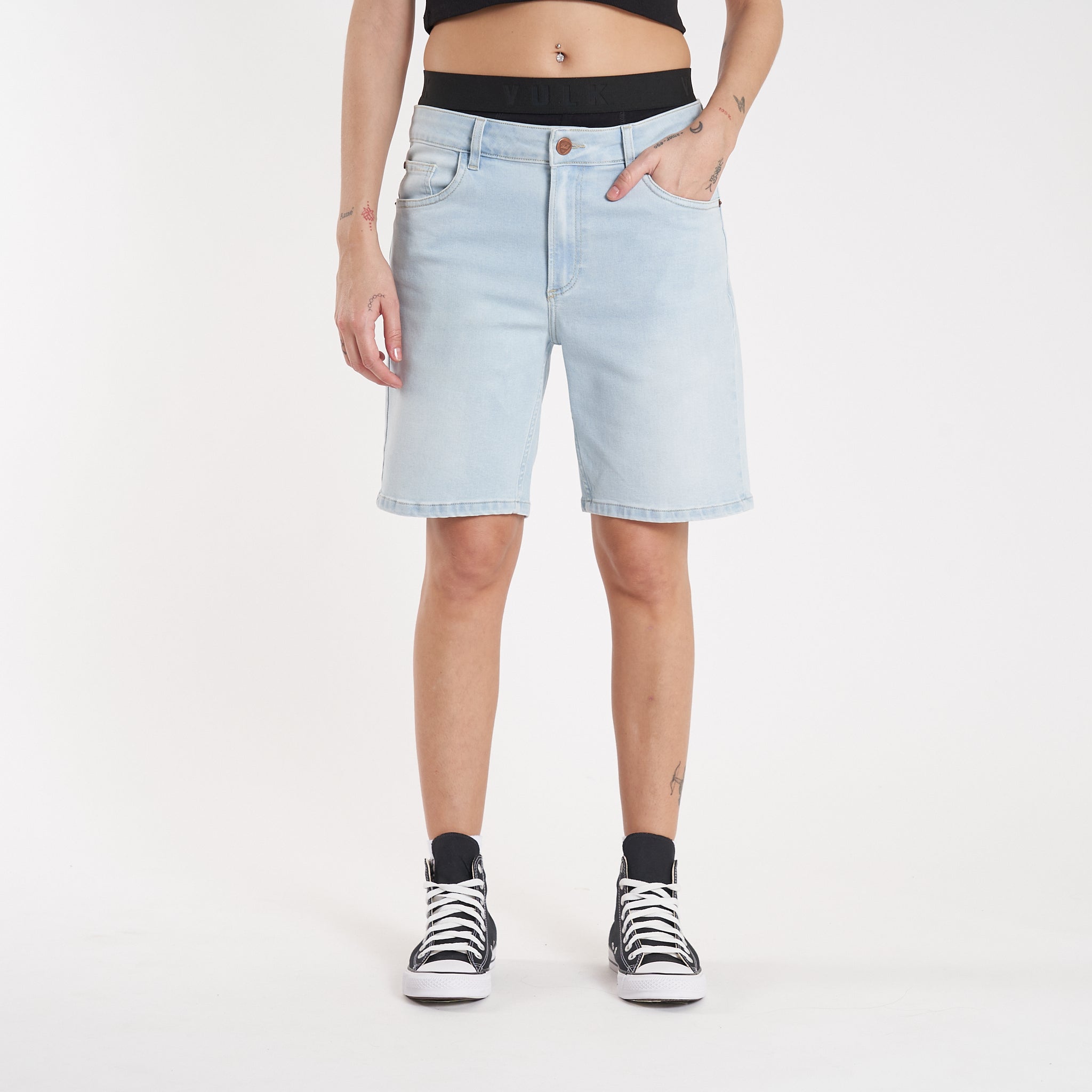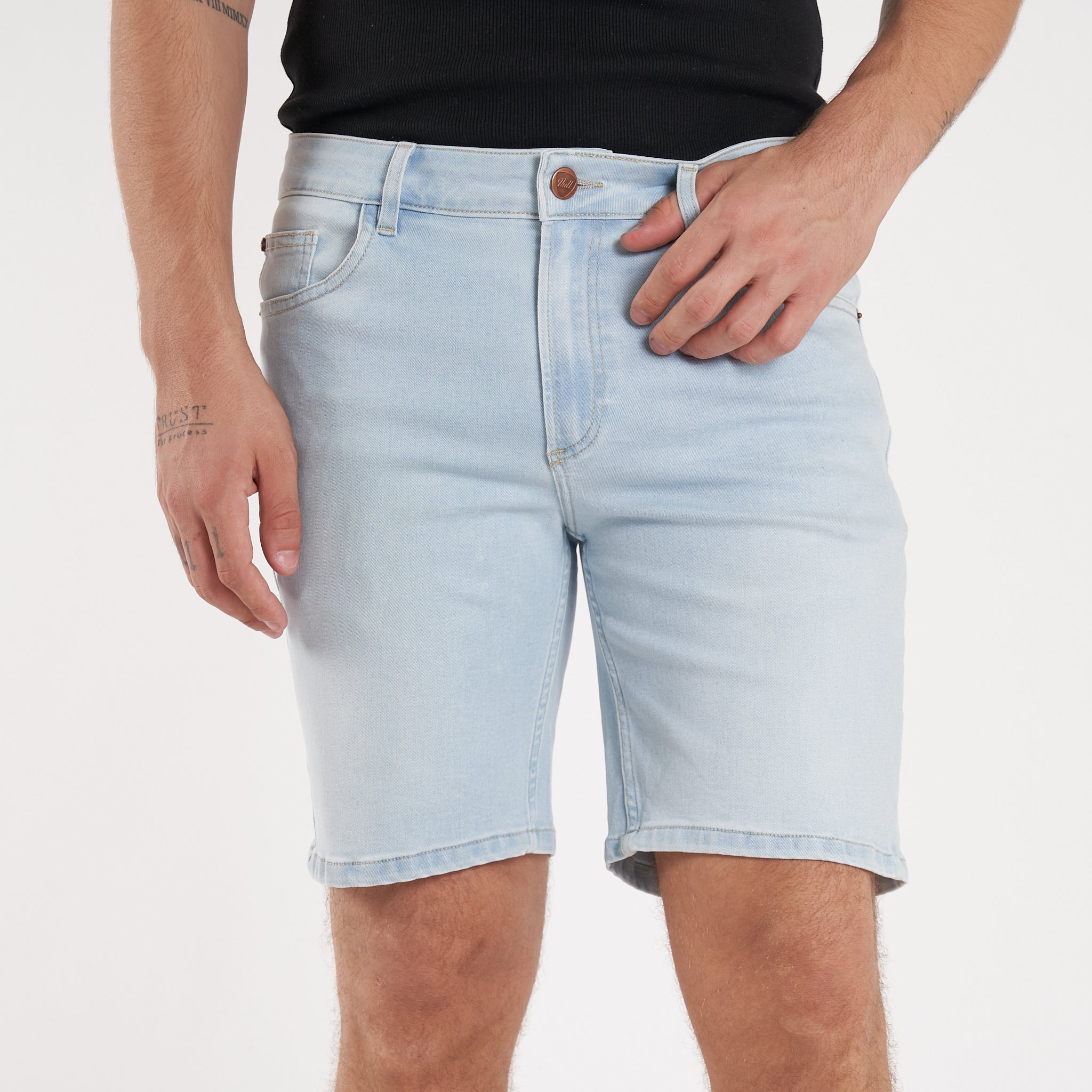 Detalles: Botones y remaches metálicos.Etiqueta de ecocuero en cintura. Lavado celeste parejo