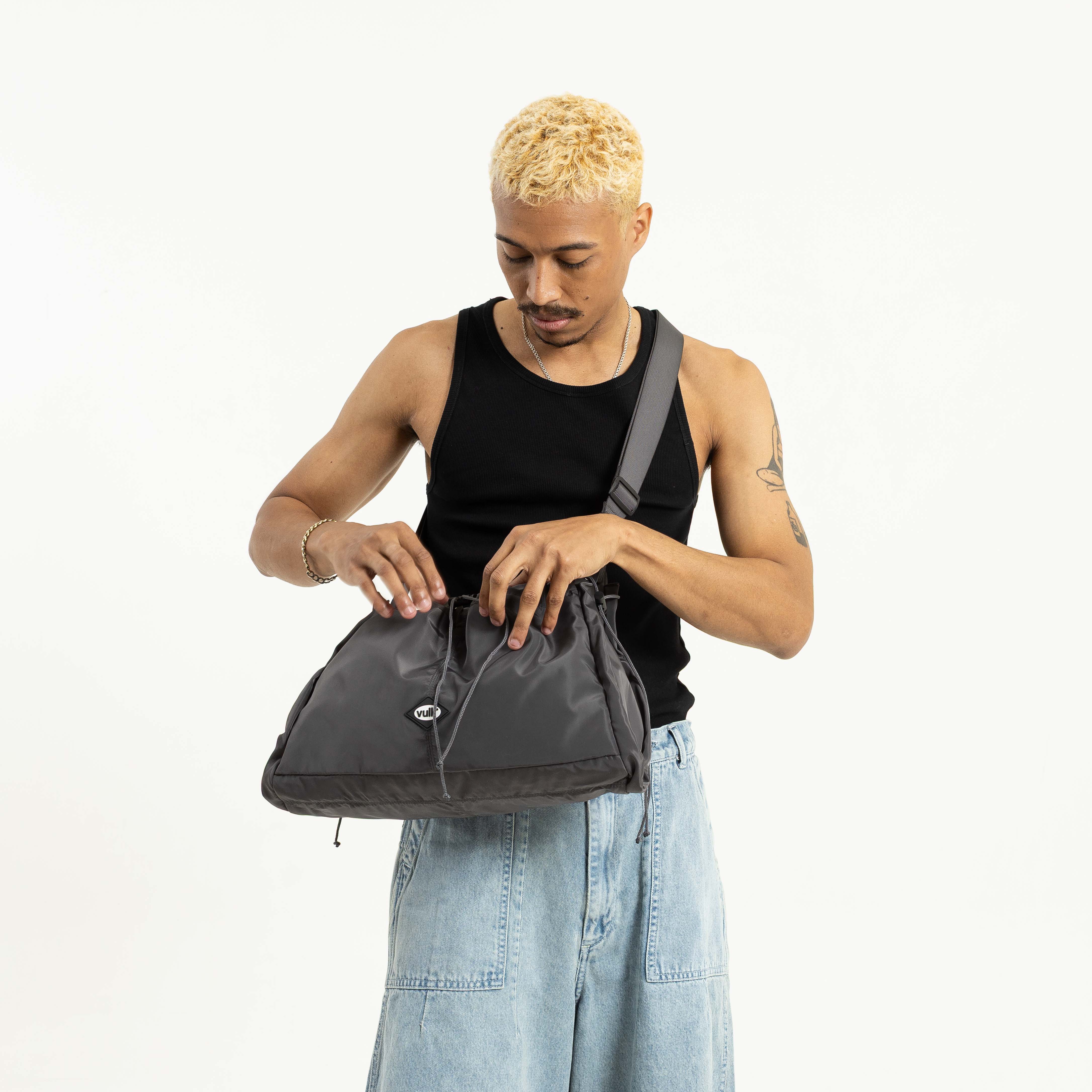 Detalles: Bandolera con detalles de tancas y sogas para ajustar y fruncir. Apertura principal con cierre. Bolsillo con botón imantado. Correa regulable y parche de goma en frente. Medidas: 43cm x 24 cm x 8cm
