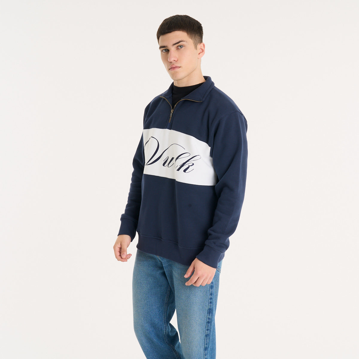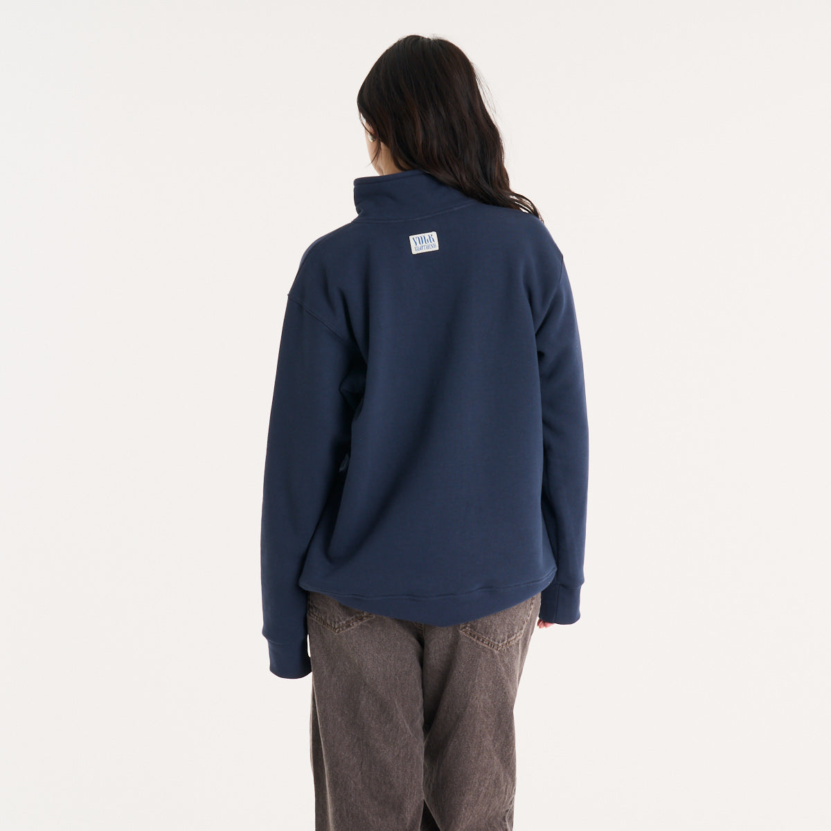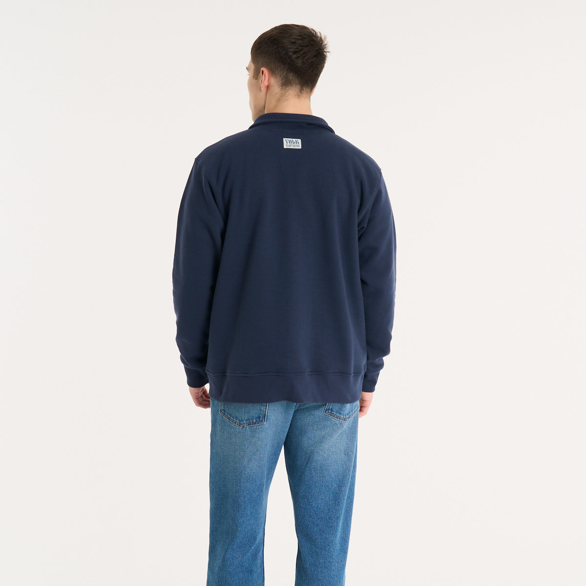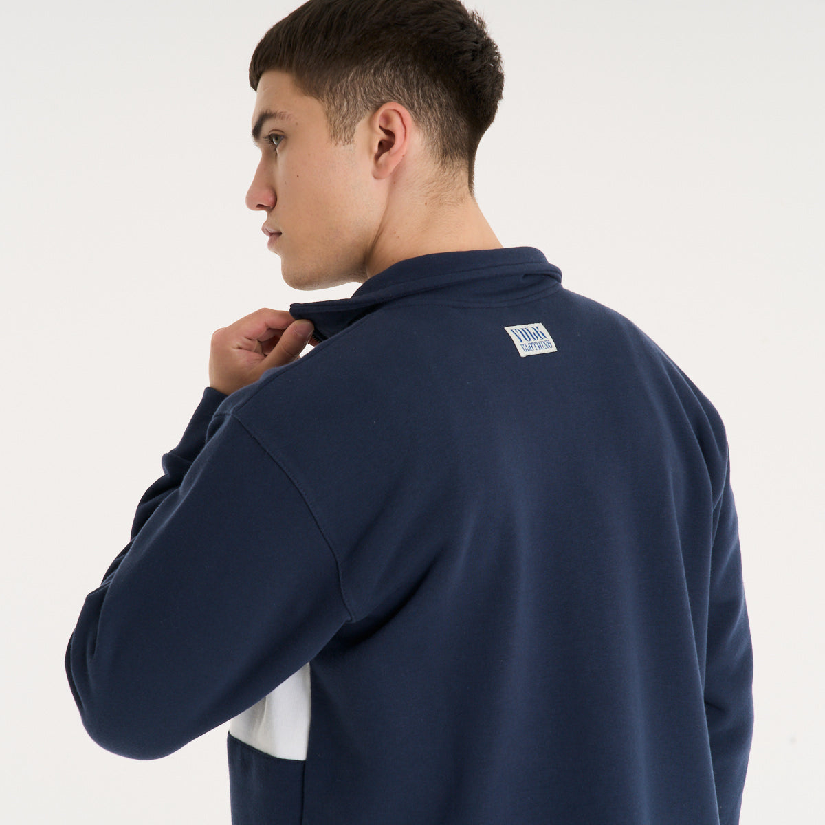 Buzo de frisa con medio cierre metálico en el cuello y un recorte frontal a contratono que le mete identidad sin gritar. El calce relax te deja moverte sin pensar en lo que tenés puesto — lo tirás encima de una remera y ya tenés look armado. La mezcla de algodón y poliéster le da ese abrigo cómodo que aguanta el día entero, desde la mañana en la calle hasta la noche en el bar. Funciona solo, funciona debajo de una campera. Half zip que resuelve sin complicar.