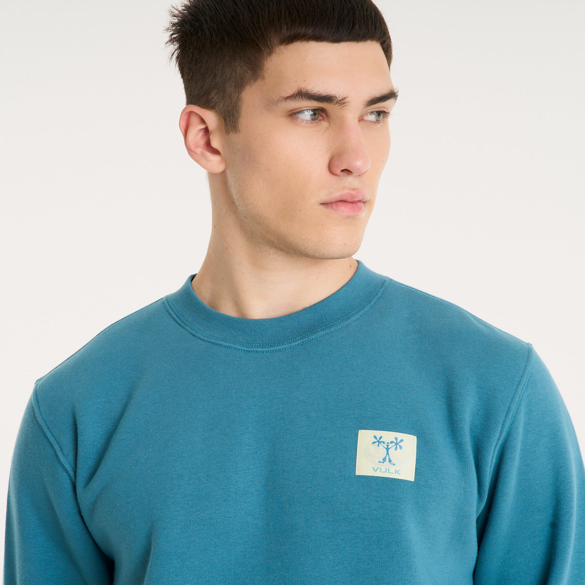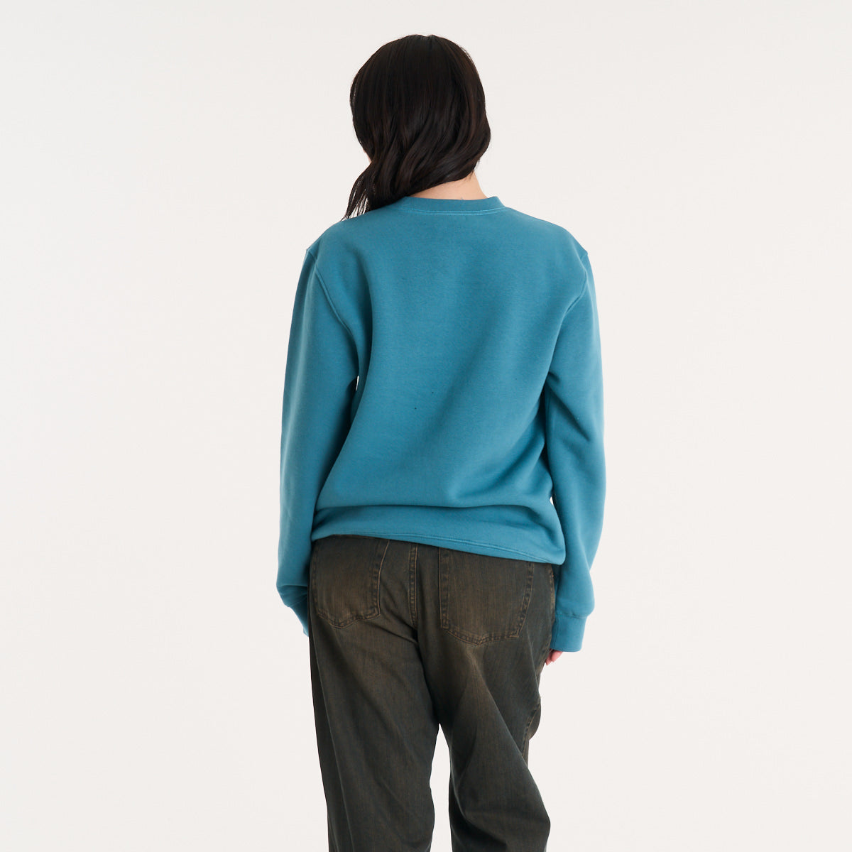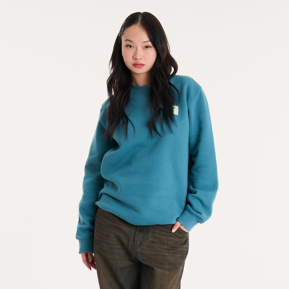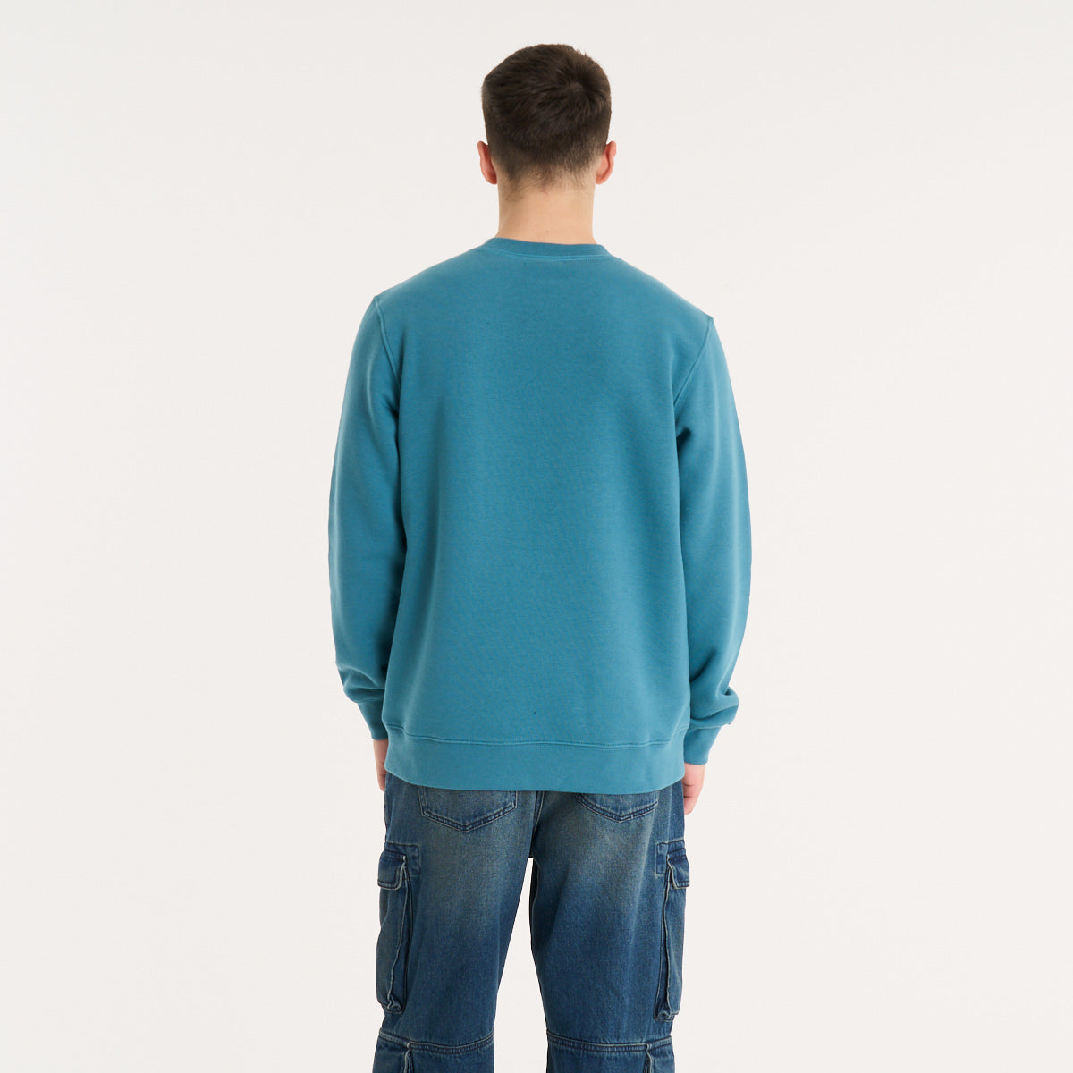 Buzo de frisa en color petrol que le mete peso al look sin complicarte. El tejido de algodón con poliéster te da ese abrigo denso que bancás todo el día sin perder forma. Calce regular, ni ajustado ni volado — lo tirás encima de una remera estampada o abajo de una campera y el outfit se arma solo. La etiqueta holográfica en el frente suma ese detalle que se nota sin gritar. Para salir a la calle cuando baja el sol o tirar a la skatepark con los pibes.
