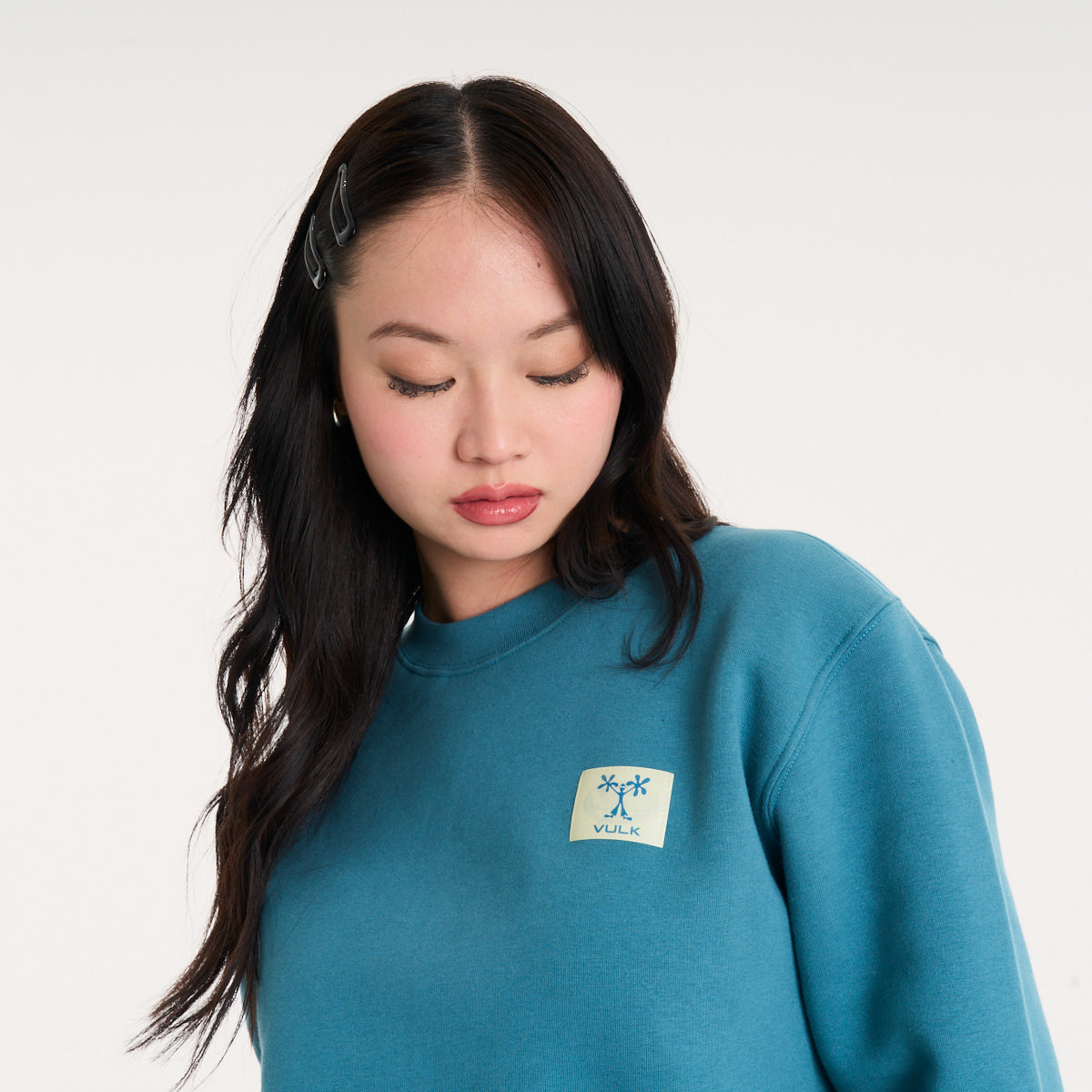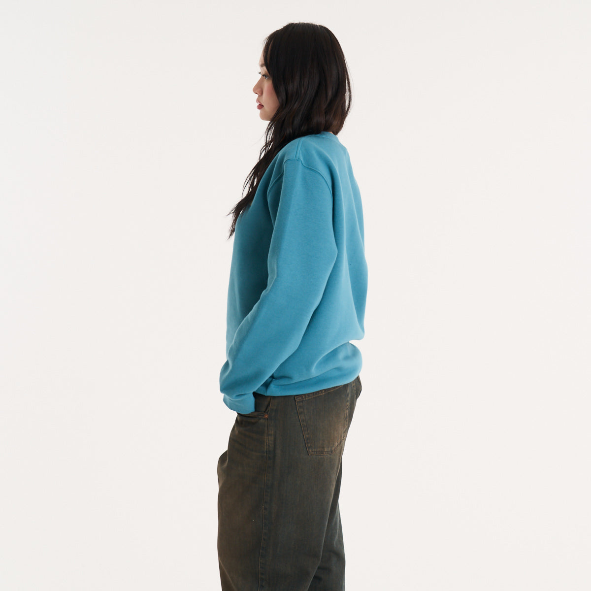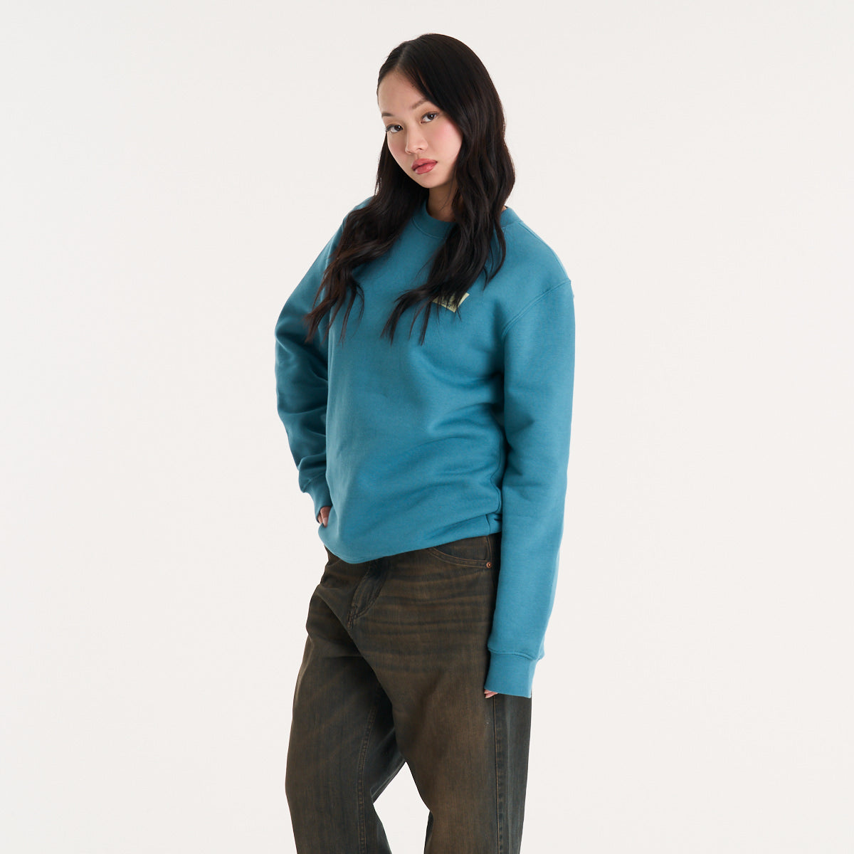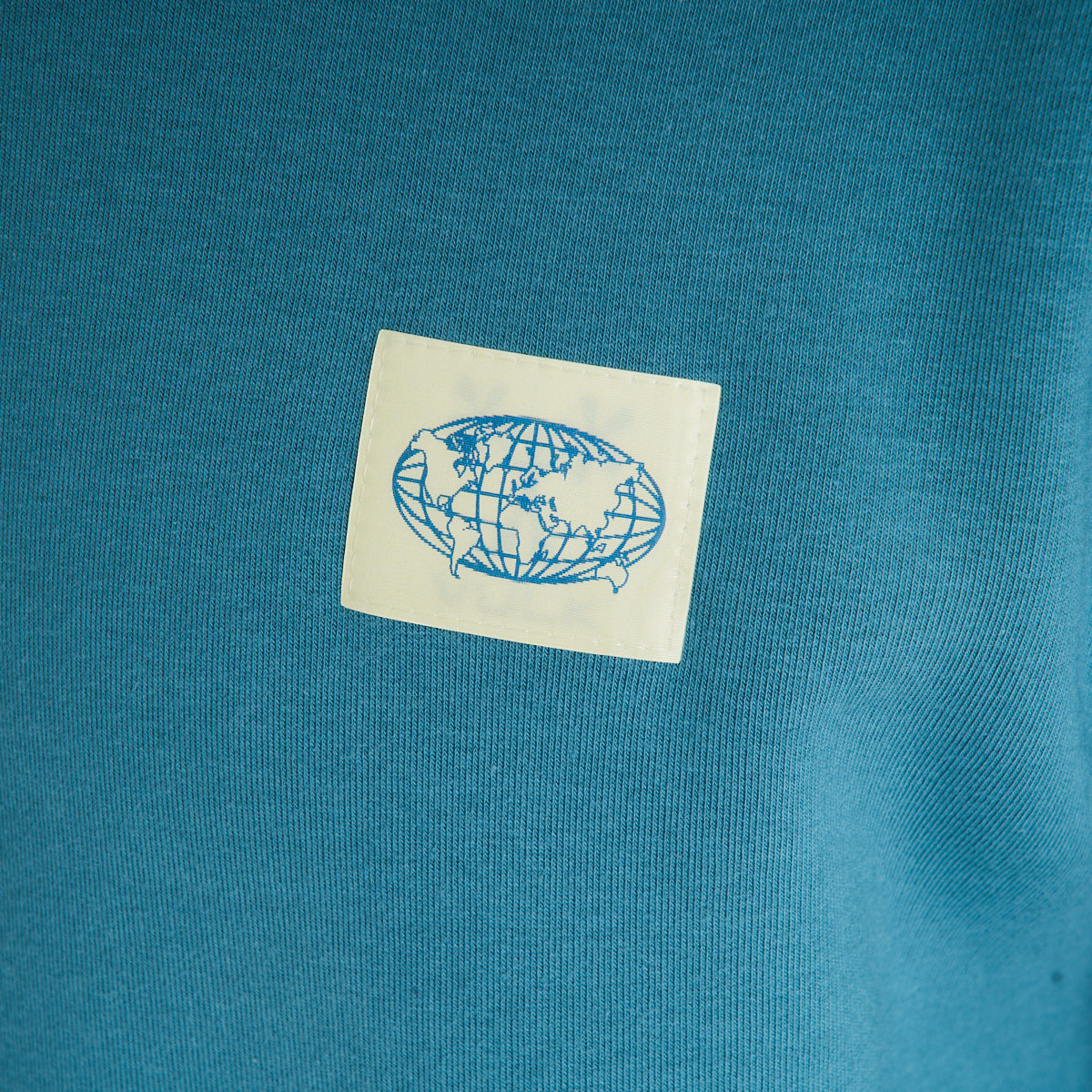Buzo de frisa en color petrol que le mete peso al look sin complicarte. El tejido de algodón con poliéster te da ese abrigo denso que bancás todo el día sin perder forma. Calce regular, ni ajustado ni volado — lo tirás encima de una remera estampada o abajo de una campera y el outfit se arma solo. La etiqueta holográfica en el frente suma ese detalle que se nota sin gritar. Para salir a la calle cuando baja el sol o tirar a la skatepark con los pibes.