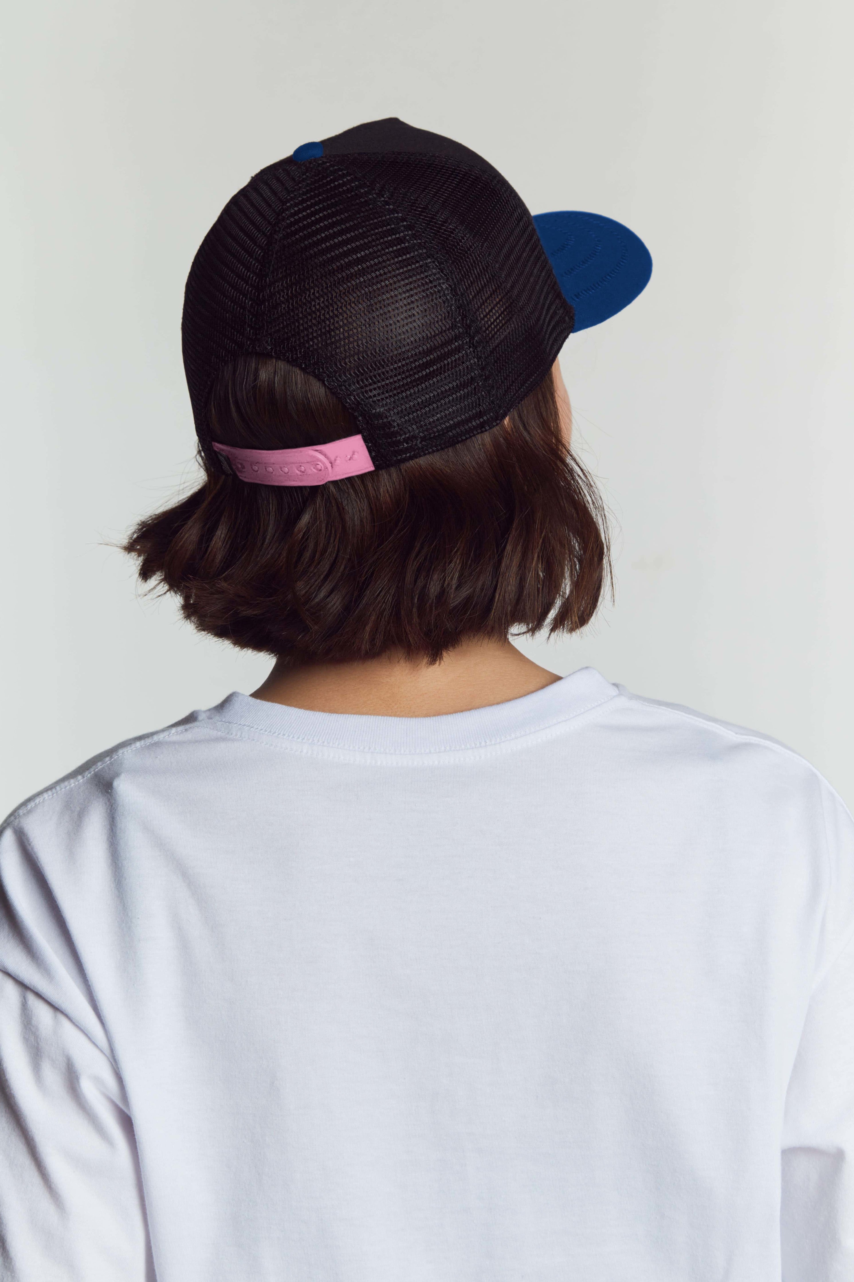 Gorra trucker 5 paneles de gabardina combinada. Visera curva. Parche bordado en frente en relieve 3D, interior personalizado, red en paneles traseros y tira reguladora.