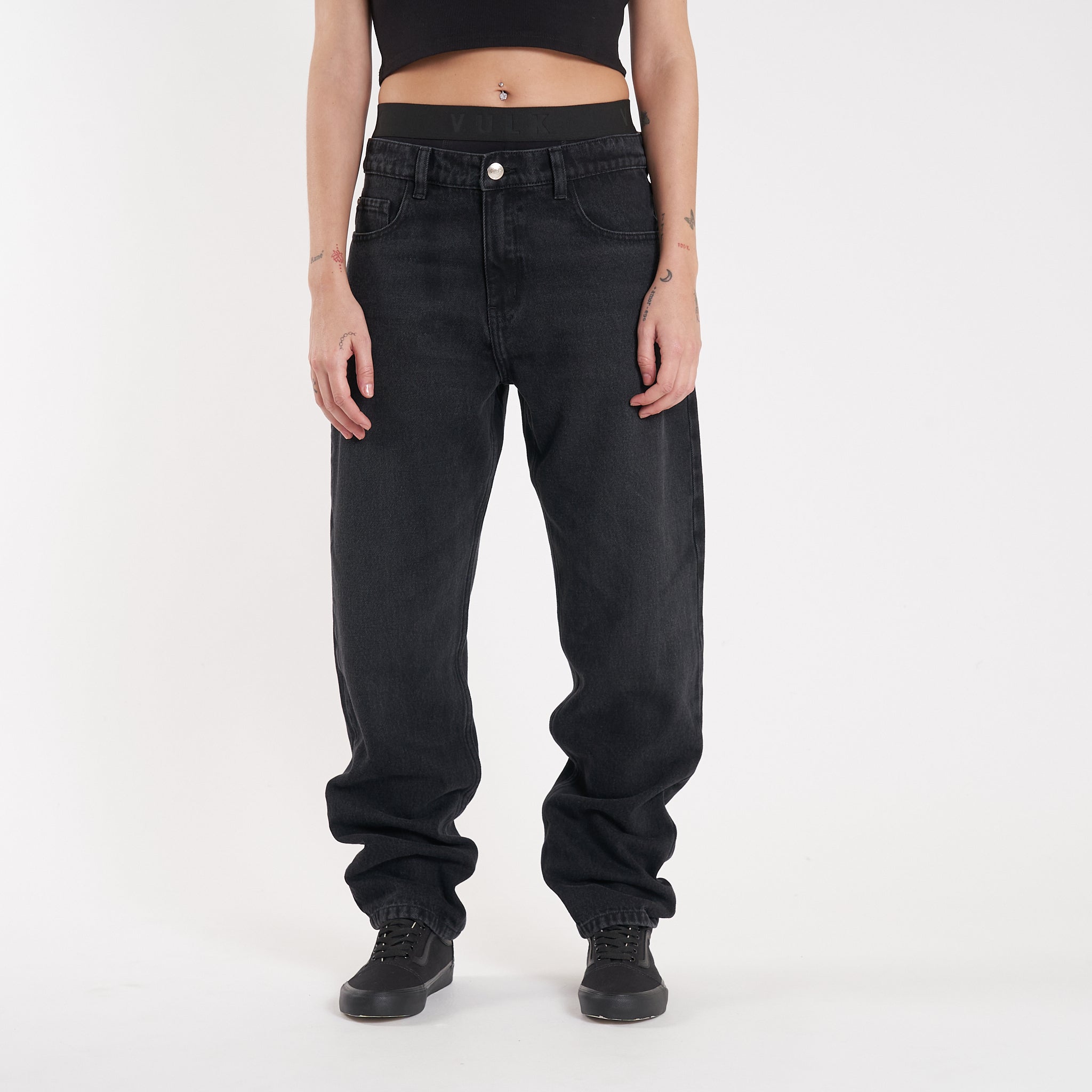 Detalles: Botones y remaches metálicos.Etiqueta de jacron en cintura.Lavado negro intenso parejo con desgastes y reservas en uniones
