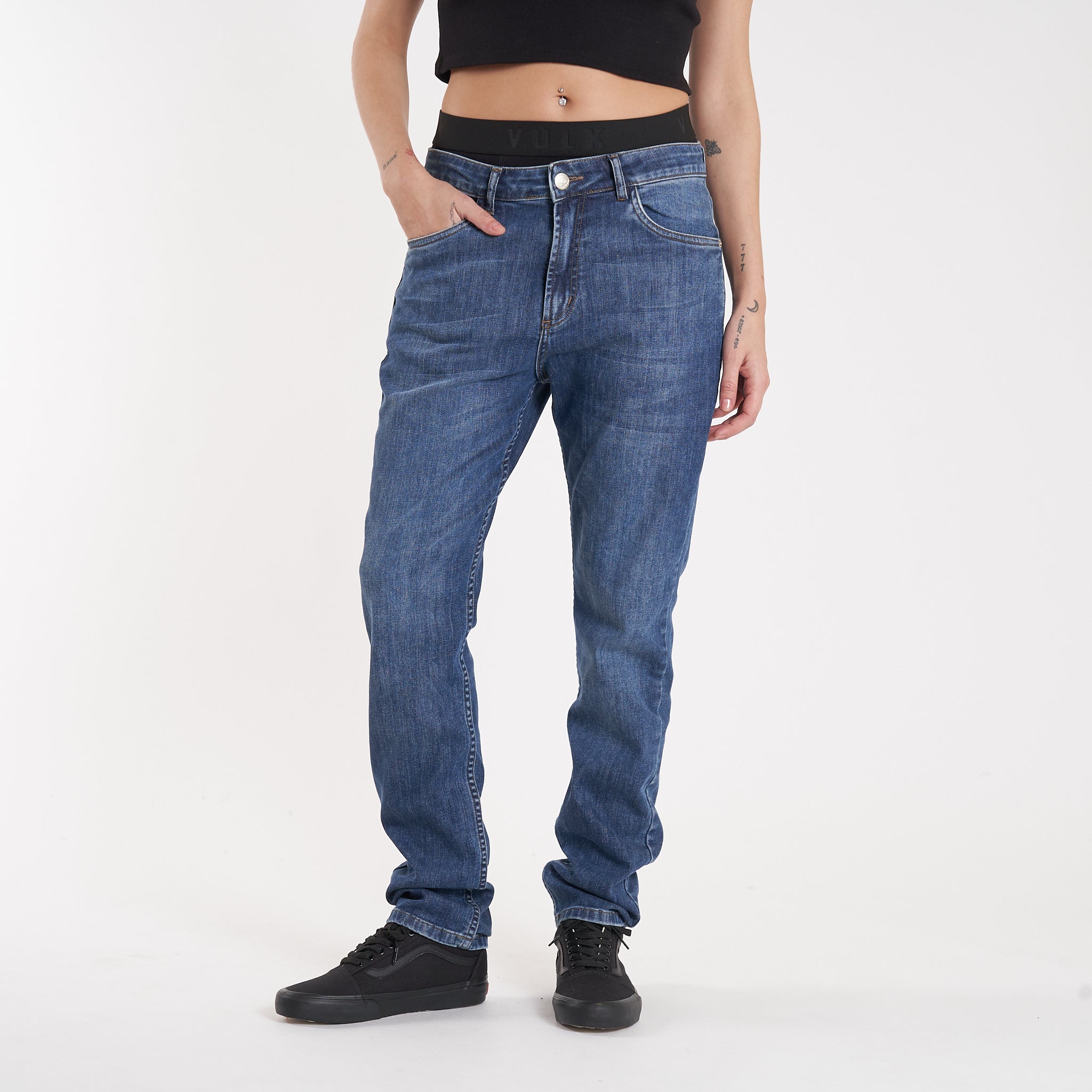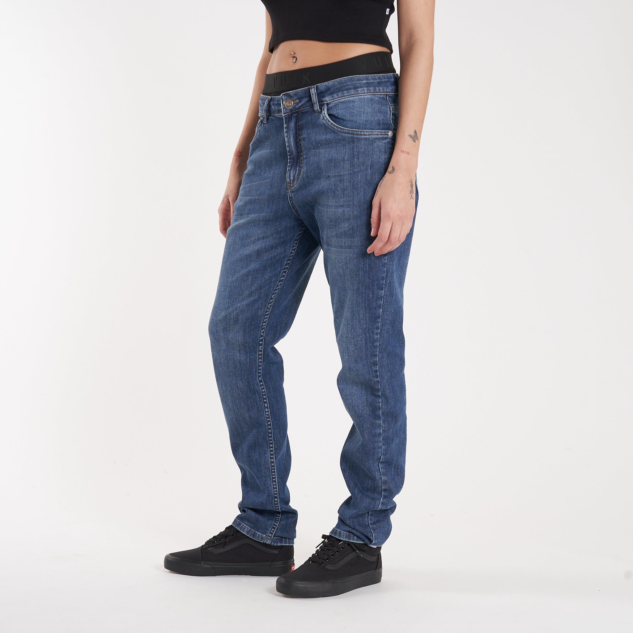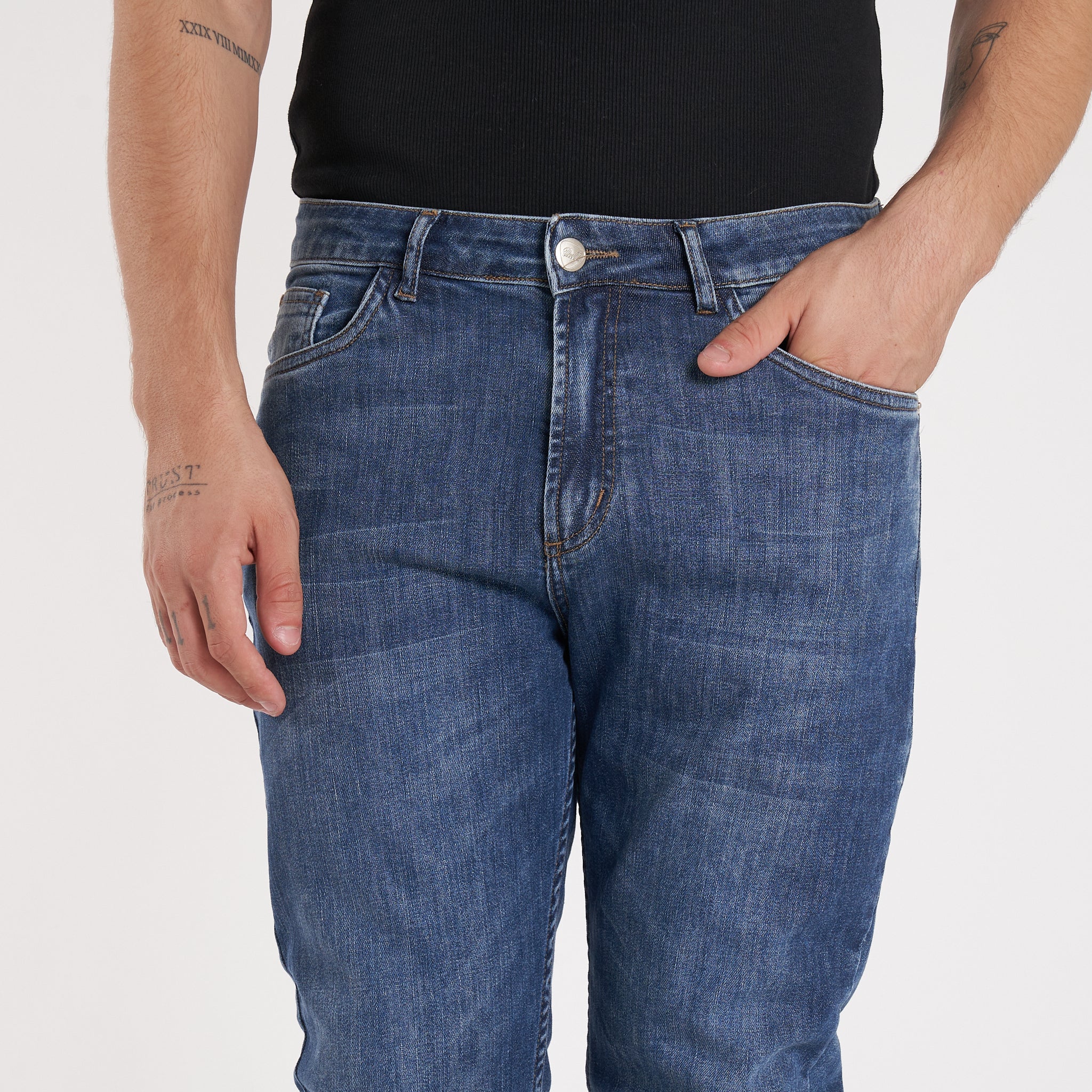 Detalles: Botones y remaches metálicos.Etiqueta de ecocuero en cintura. Lavado azul oscuro con desgastes y reservas en costuras